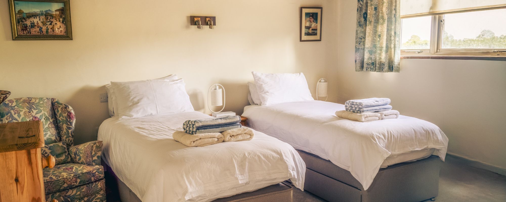 1 bedroom with king-sized 4 poster bed, and separate bathroom. 1 bedroom with twin beds and en-suite bathroom.